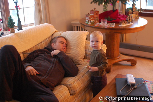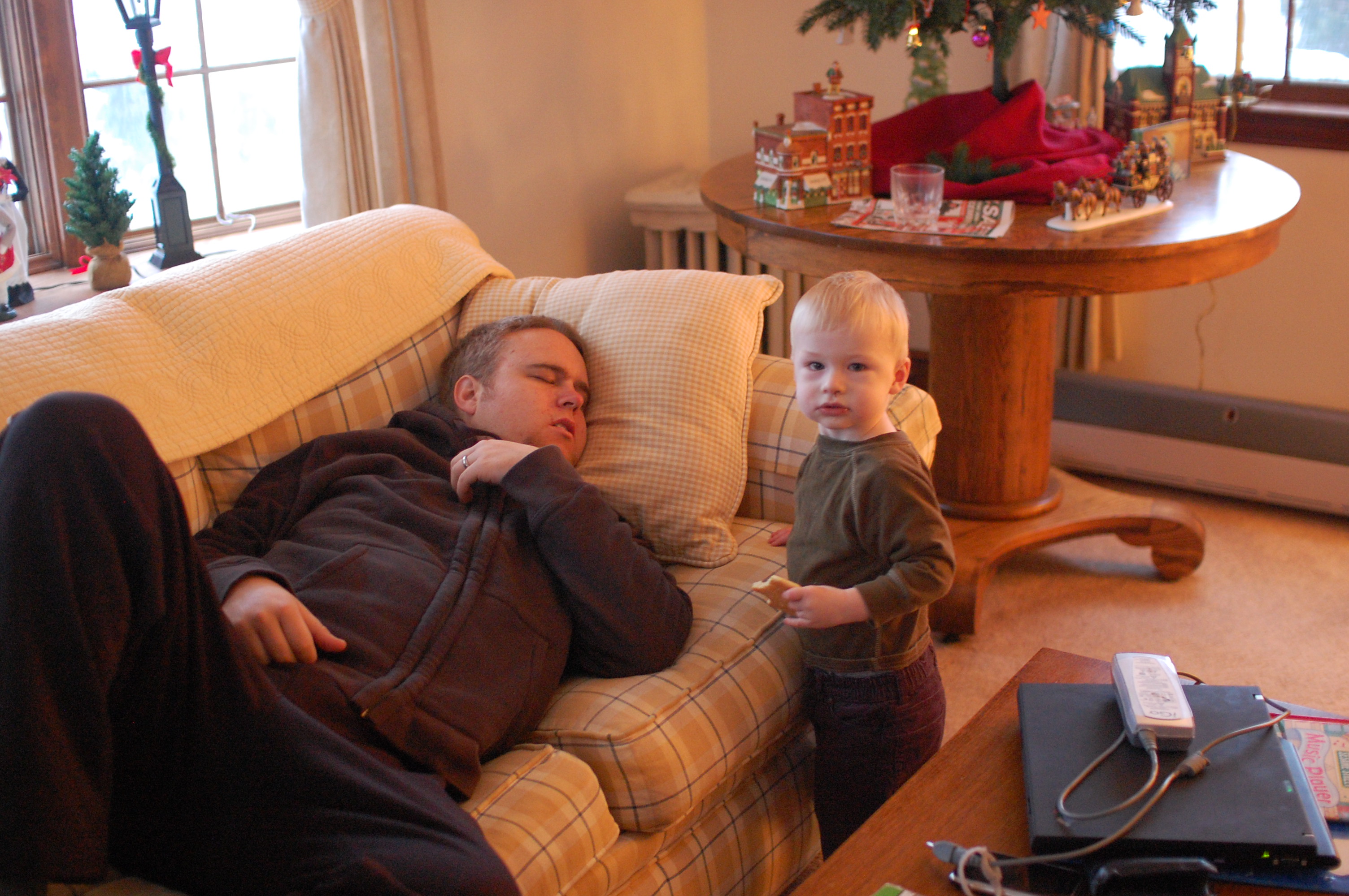 Devin chomps on a cookie while dad catches up on rest.