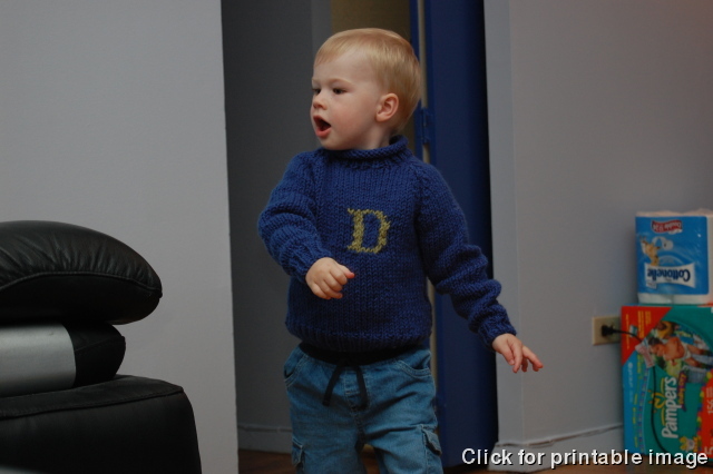 Showing off his new JoJo sweater in our apartment.