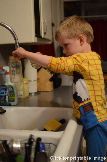 Devin helps out by washing Grant's bottles at night.