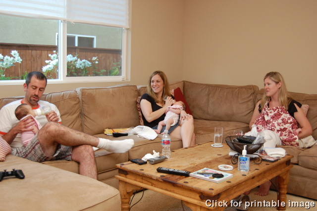 Devin's first dinner party, with Noa and Jordan, the newborn twin daughers of Jonalyn's good frend Stacy.